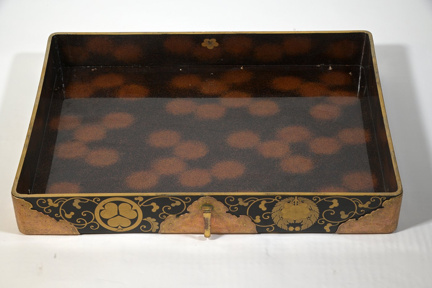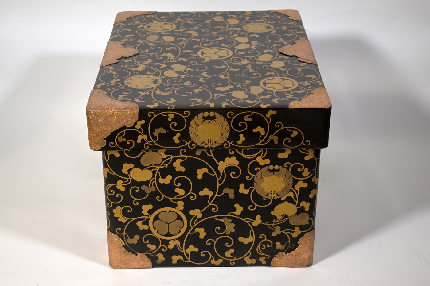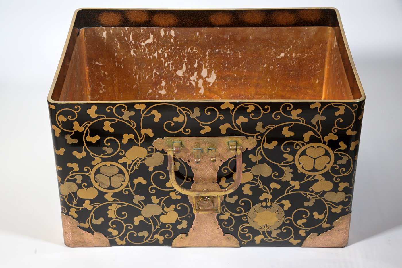 A Japanese black and gold lacquer coffer opening to a drawer in lacquer , with a fine decor of flowers and leaves anround central motifs ( maybe heraldic ) , Nagamochi, with gilded brass corner and handles .In very good condition, the inside borders in gold lacquer with some slight damage.