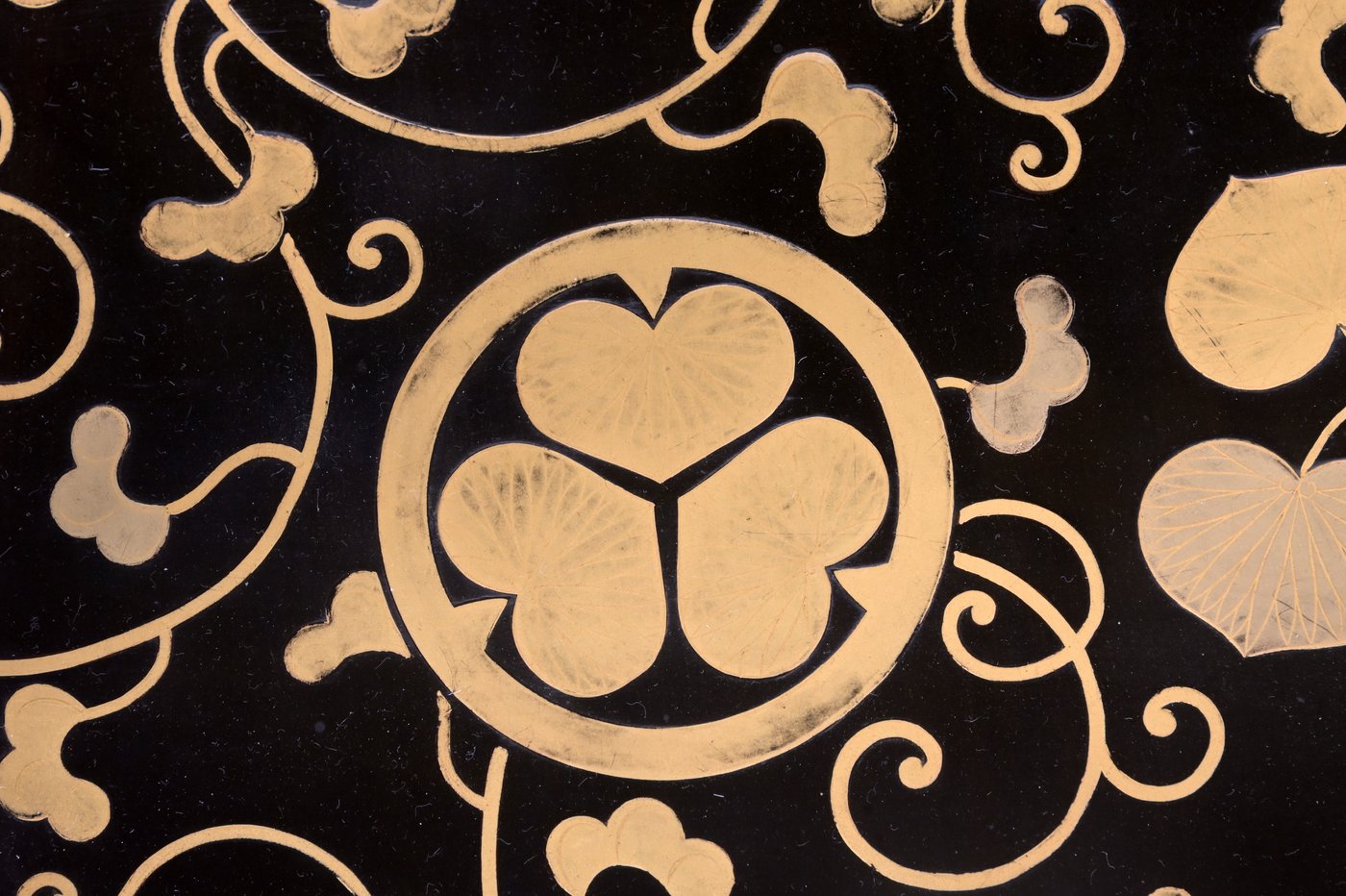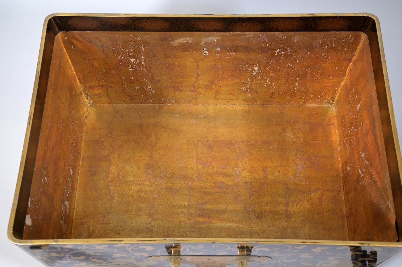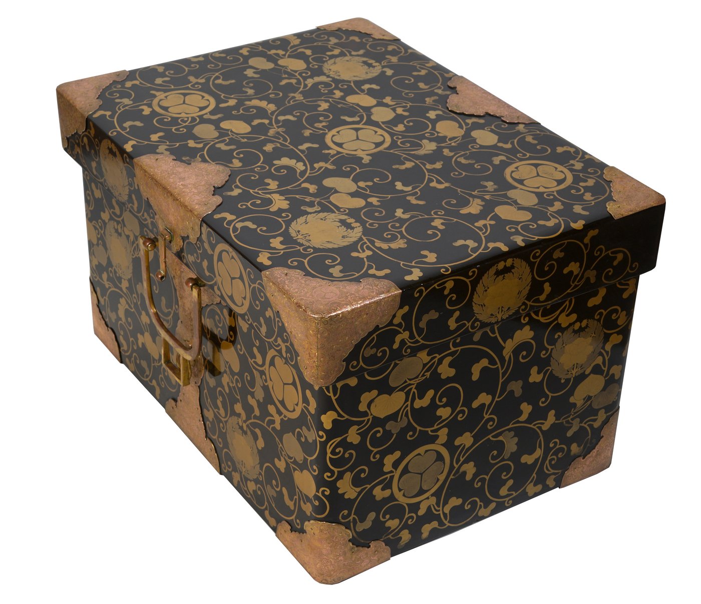 A Japanese black and gold lacquer coffer opening to a drawer in lacquer , with a fine decor of flowers and leaves anround central motifs ( maybe heraldic ) , Nagamochi, with gilded brass corner and handles .In very good condition, the inside borders in gold lacquer with some slight damage.