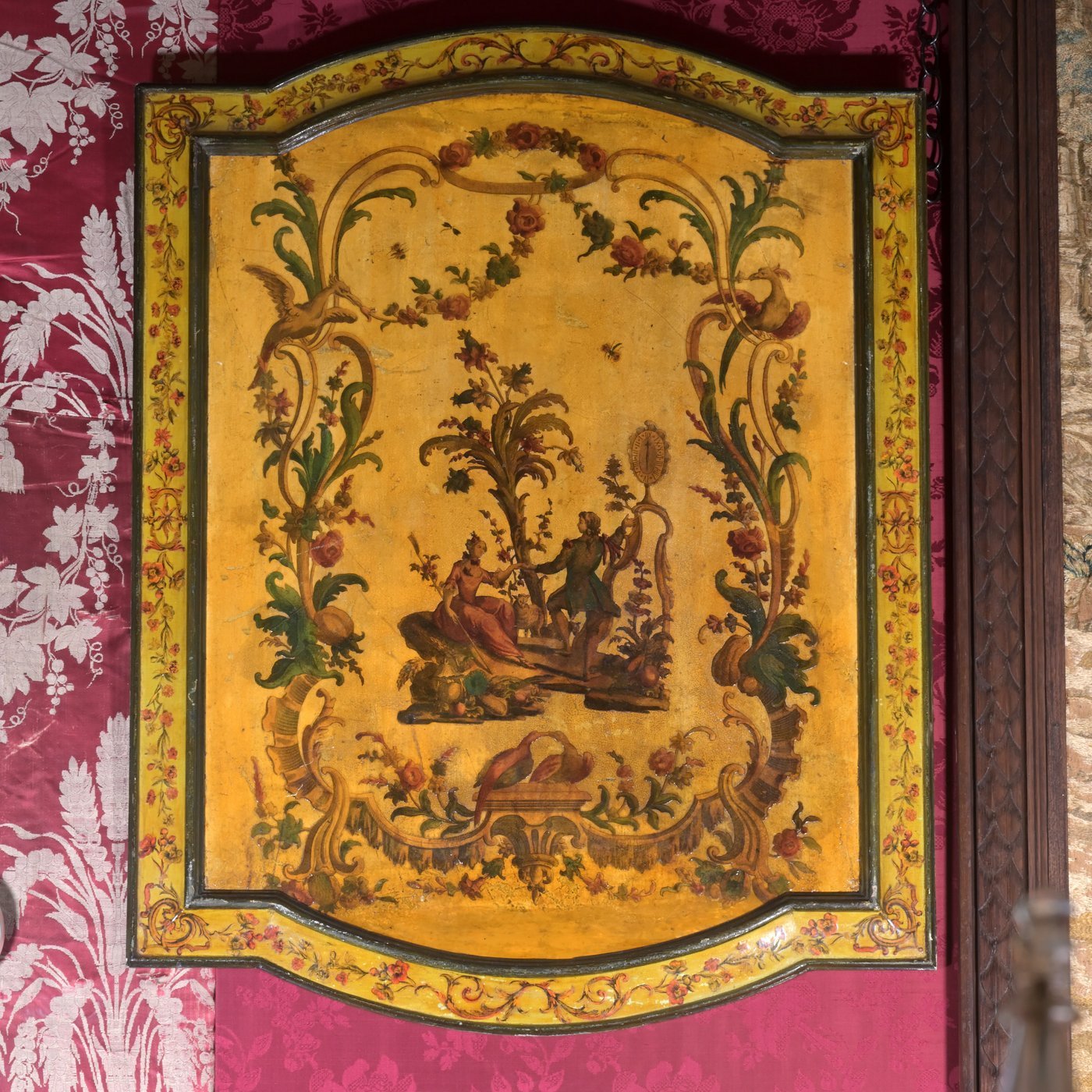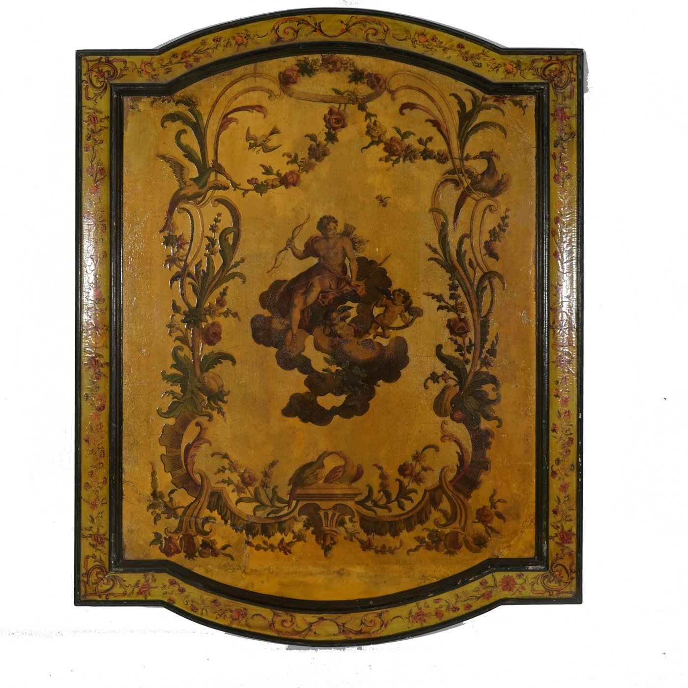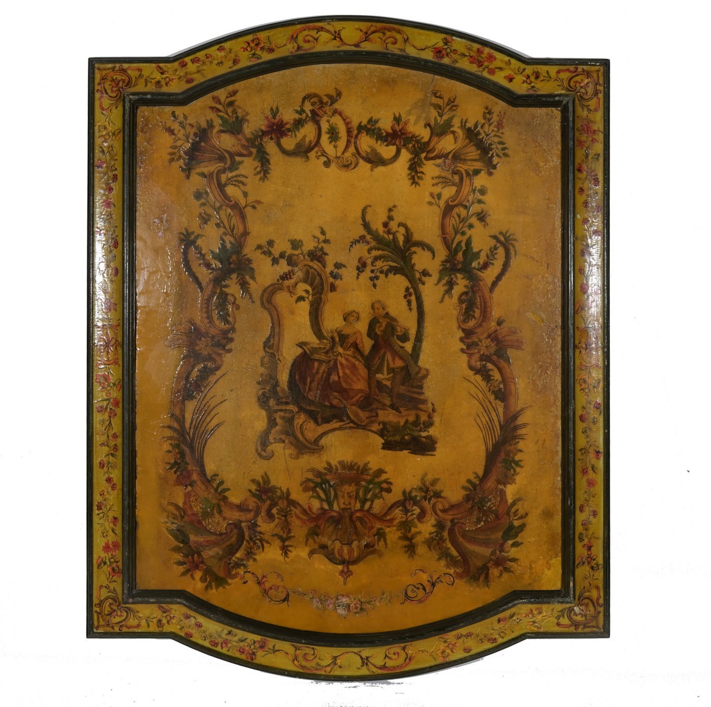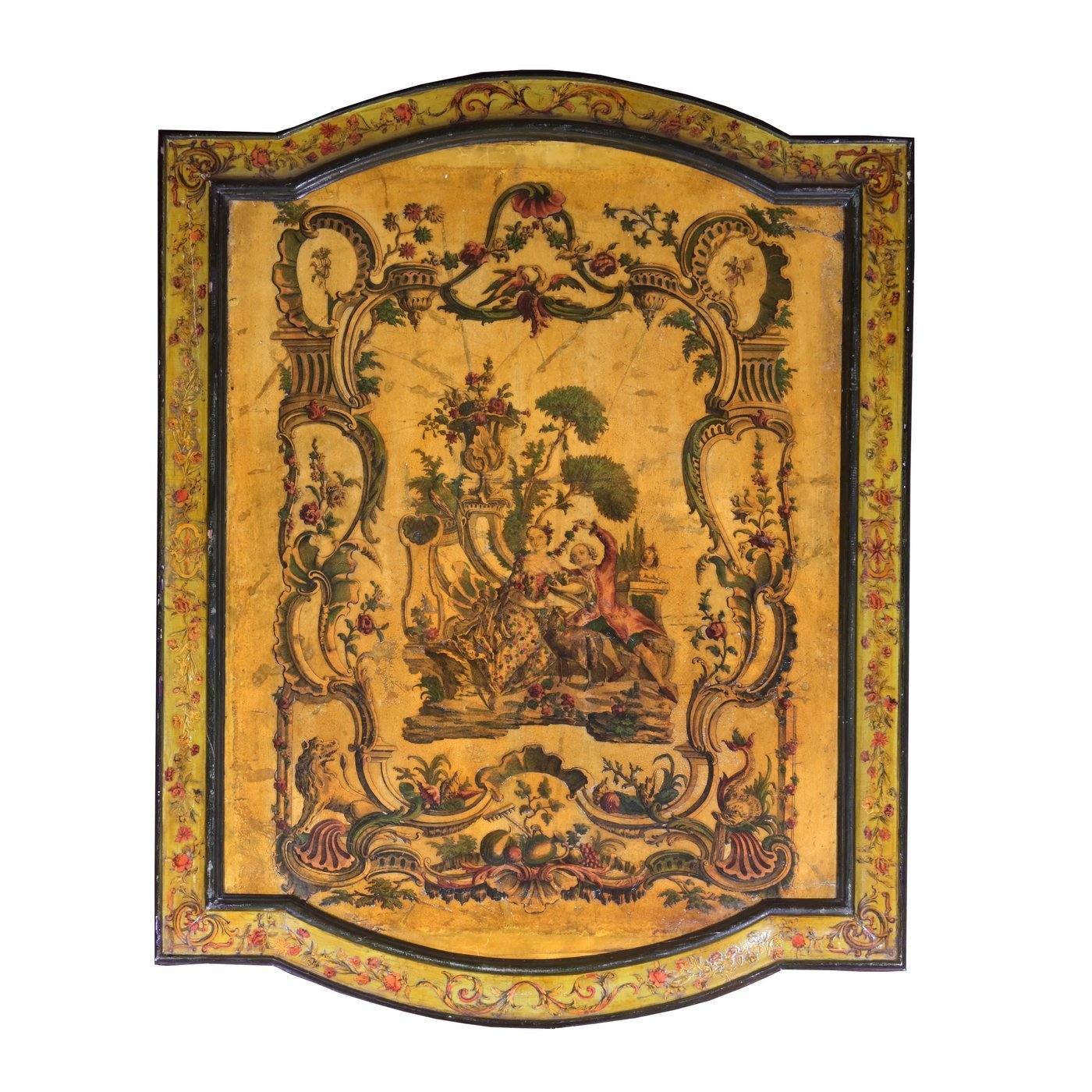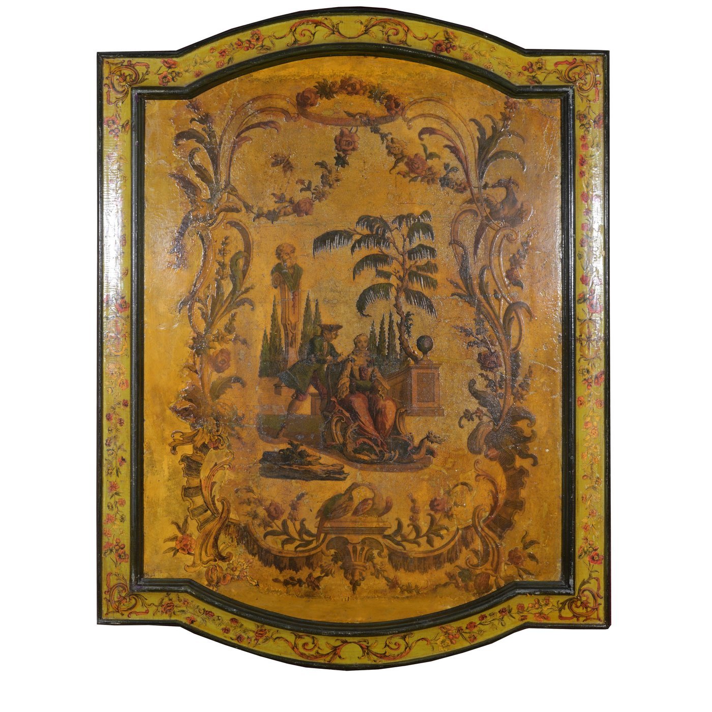 A rare set of six Venetian Rococo period panels painted on yellow background mounted on wood , in their original wooden frames also painted with arte povera decoration.