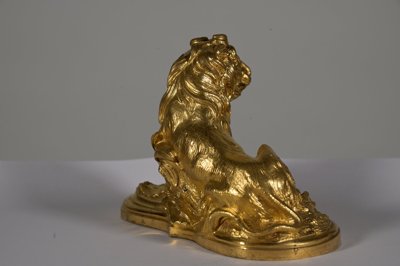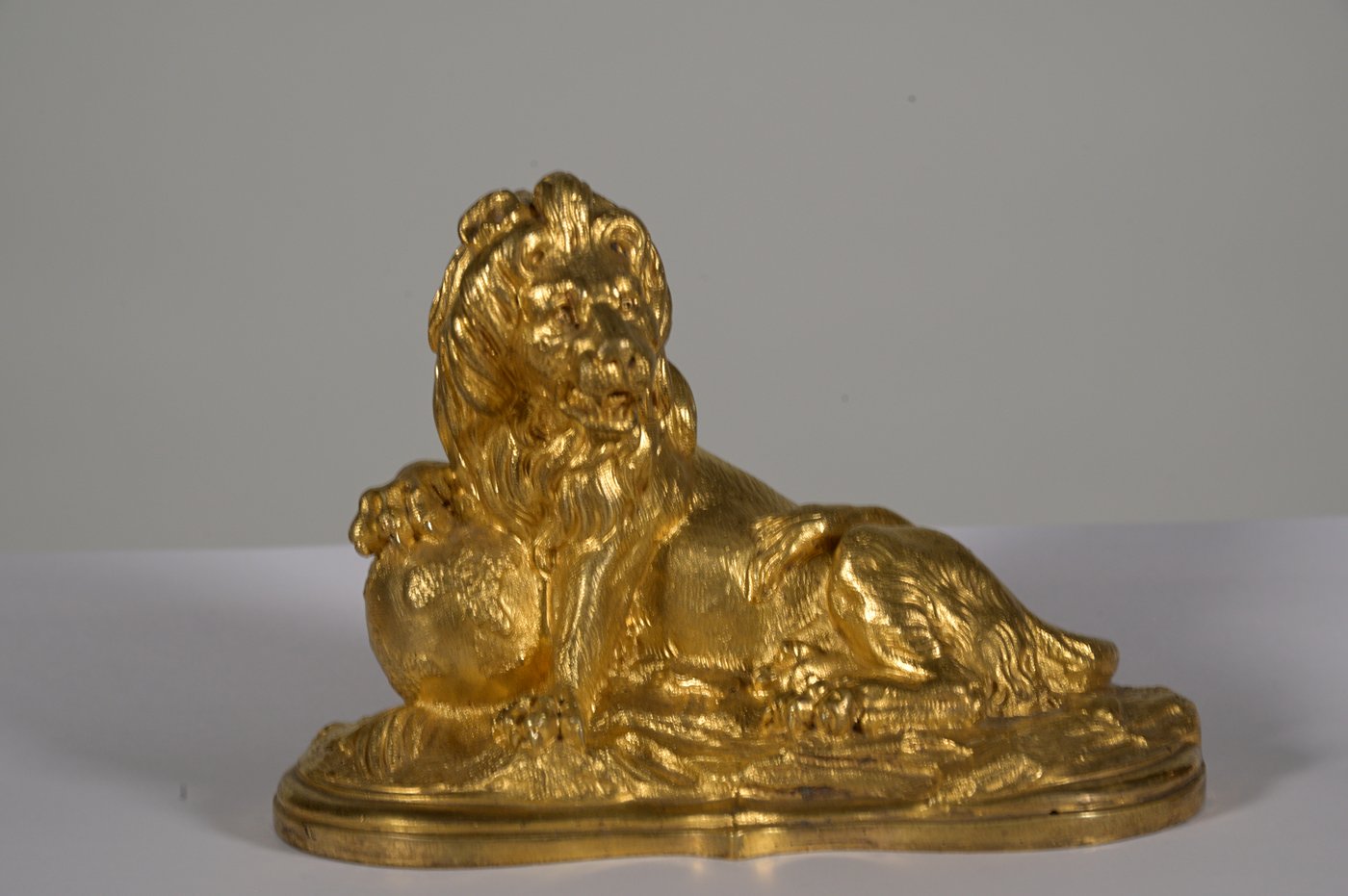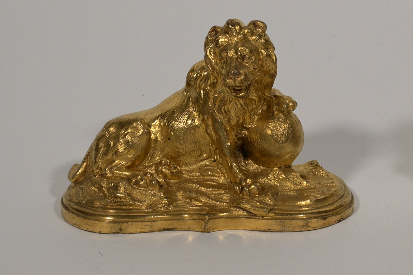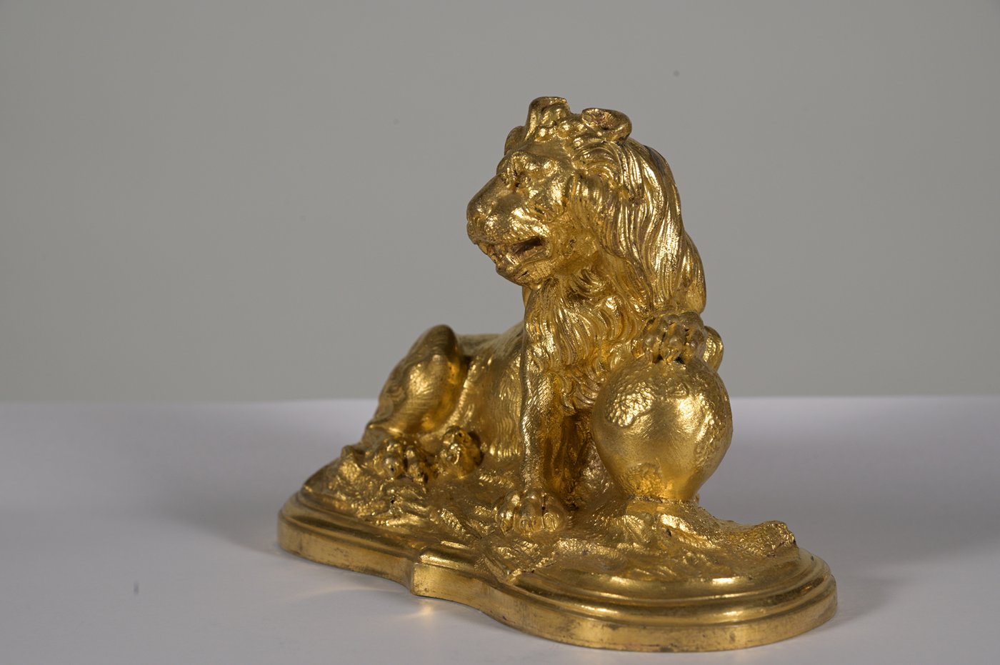 A pair of French Louis XV style gilt bronze chiselled reclining lions holding a ball and facing each other, objetcs for a desk or a table  decoration, mid-19th century.
