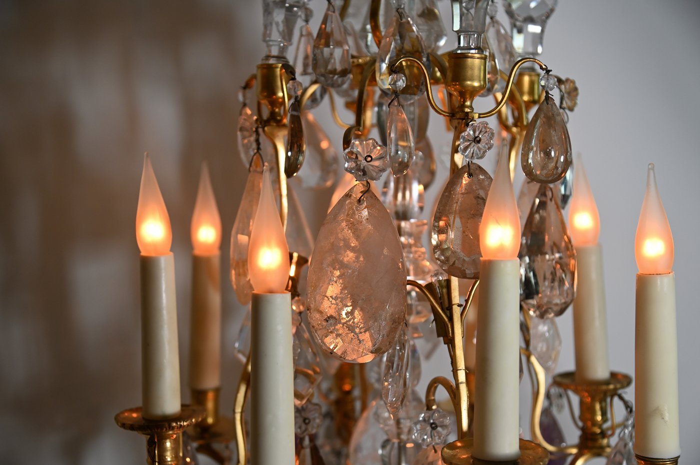 They consist of 8 arms and have a double electrification: one lighting for the arms and one indirect lighting for the inside of the rock crystal structure.