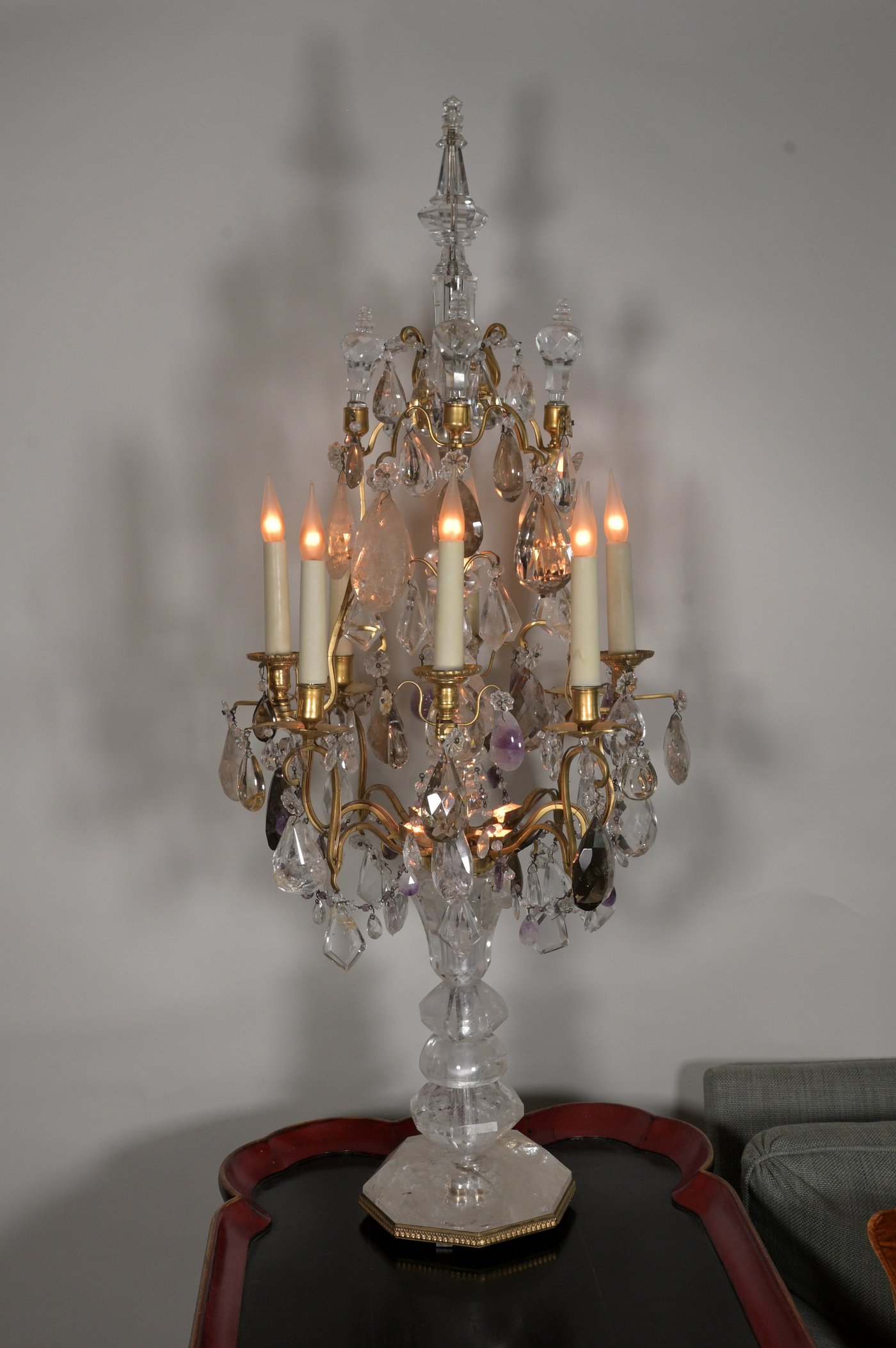 An exceptional pair of large French Louis XV style rock crystal, amethyst and gilt bronze girandoles on octogonal rock crystal bases , by the famed Maison Baguès, Paris, circa 1930.