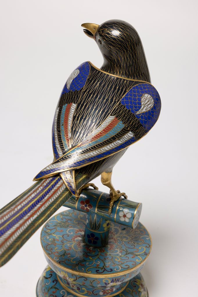 A pair of large and delicate Chinese cloisonné on bronze birds with long tails standing on circular bases , on a blue background, the body of each bird opening to form perfume or incense burners.