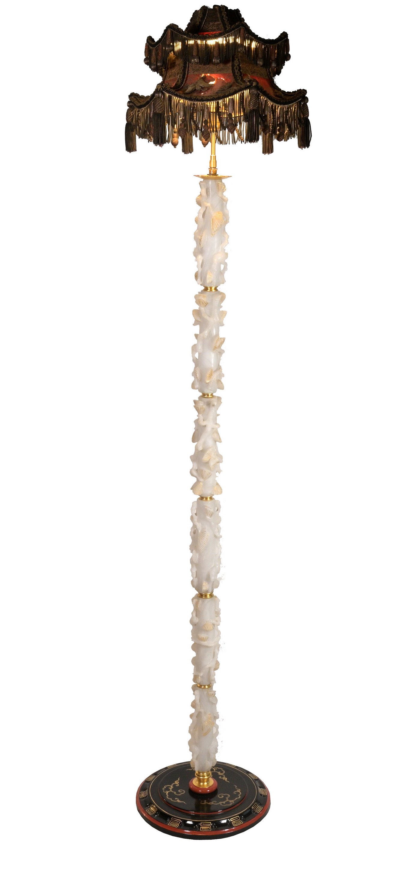 A very unusual Chinese or Chinoiserie 1930's standing lamp with the central part in white stone with leaves carved and partially gilded , the base in lacquered metal in the Chinese manner and the pagoda shaped shade in silk with appliqués of embroideries ( some damage to the silk and embroideries)
