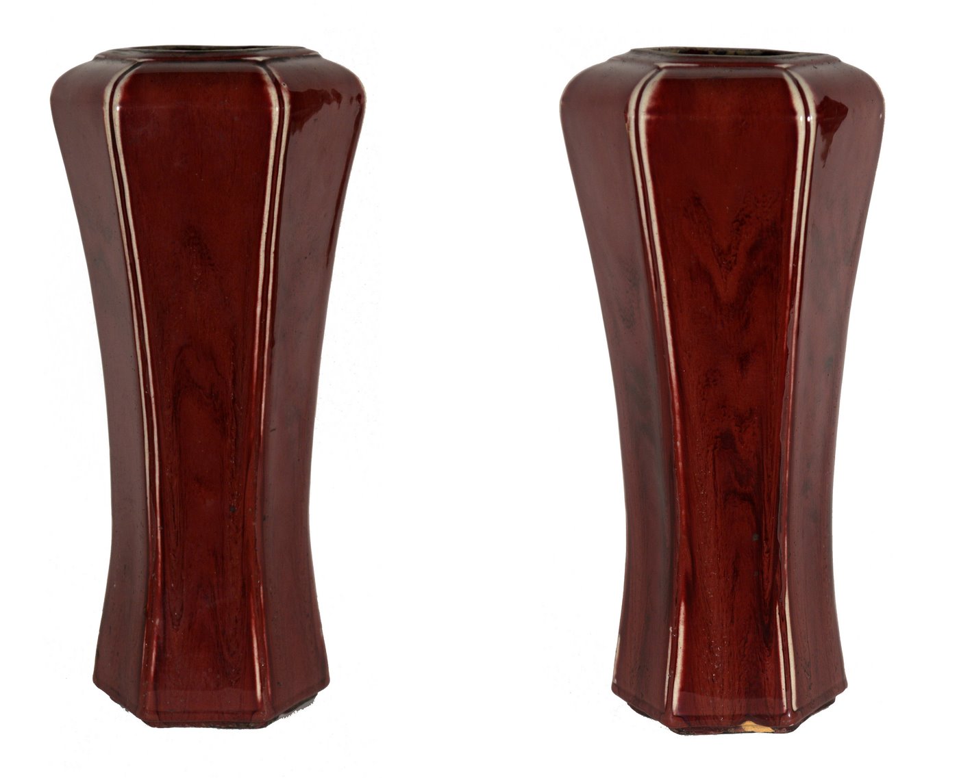 A pair of large Chinese 19th century baluster shaped red vases " sang de boeuf " with six sides , with lovely shades of red, with a blue seal under the base , now mounted as vases ( not pierced)