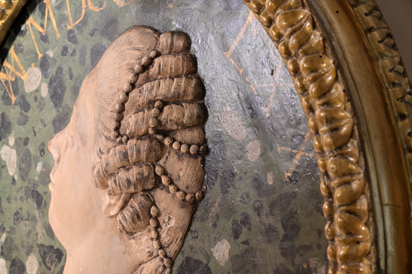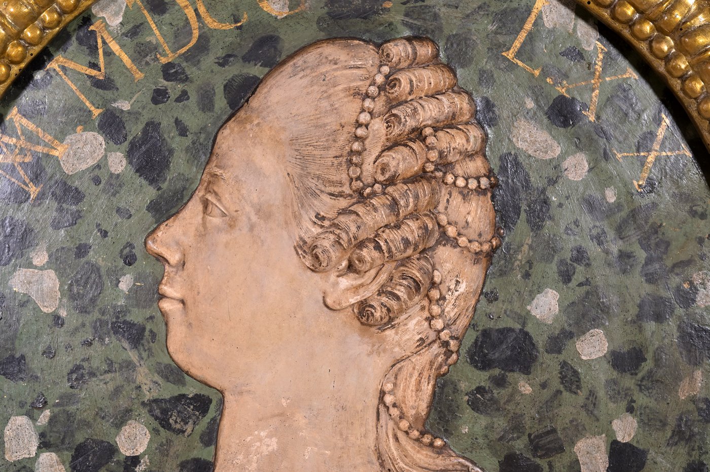 A large circular medallion representing Queen Marie Antoinette when she arrived in France as a very young Dauphine in 1770 ( dated on the border) , with pearls in her elaborate wig.