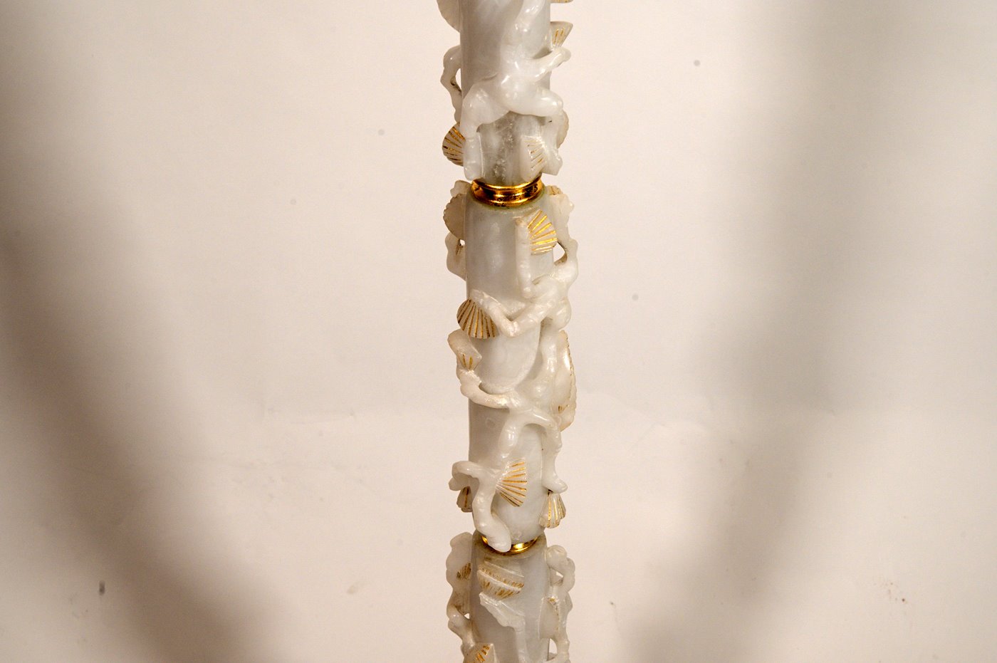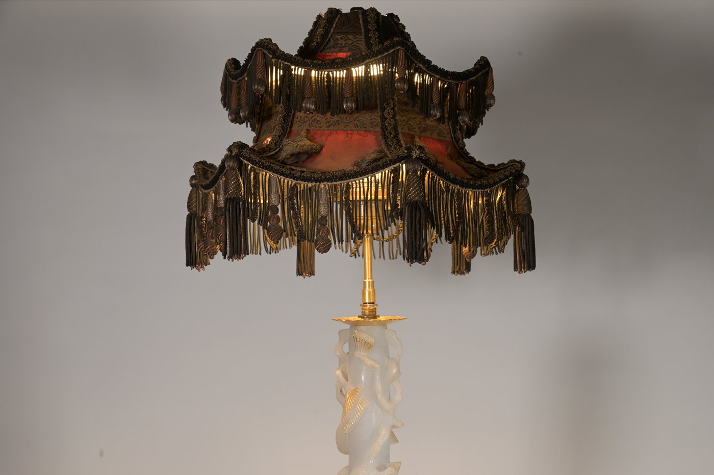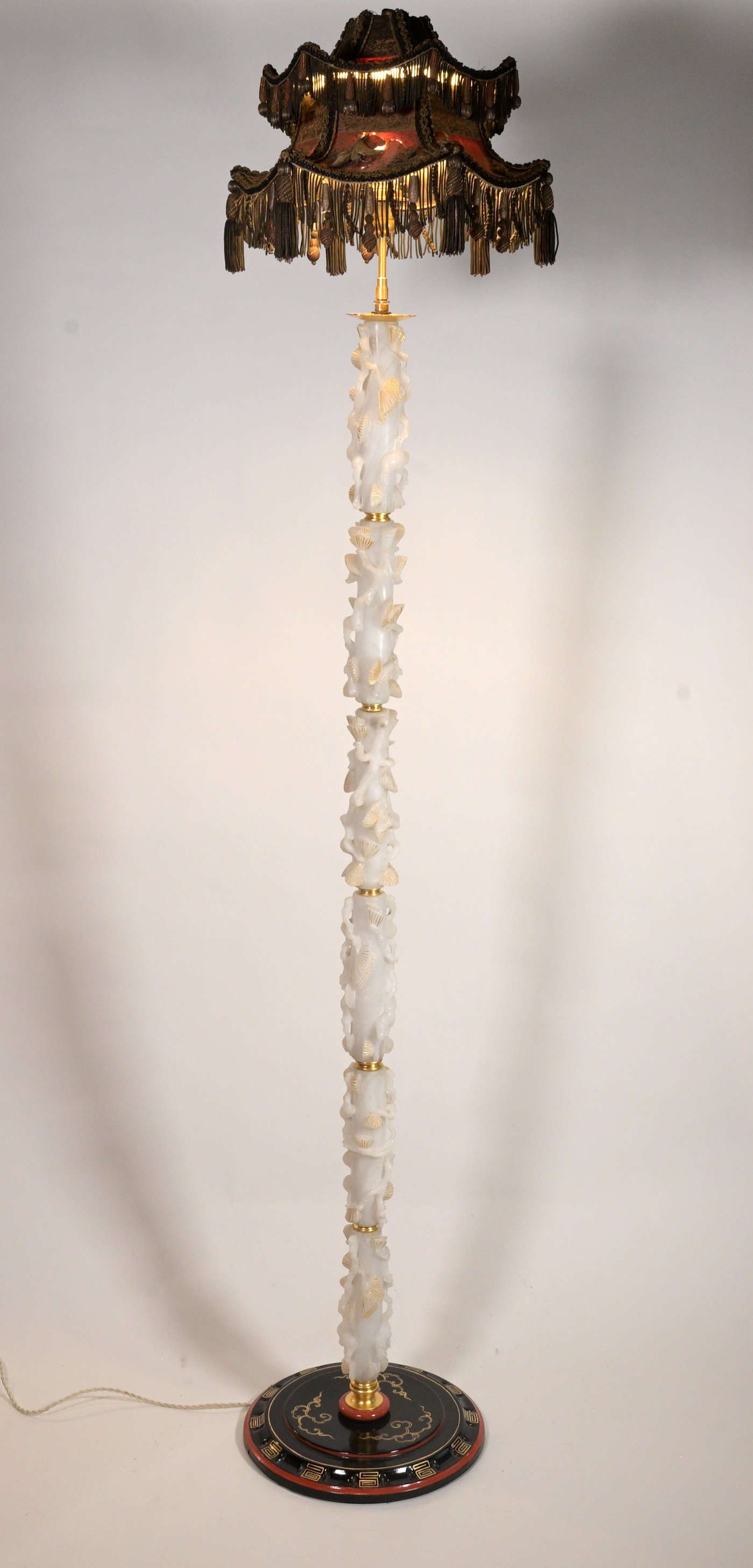 A very unusual Chinese or Chinoiserie 1930's standing lamp with the central part in white stone with leaves carved and partially gilded , the base in lacquered metal in the Chinese manner and the pagoda shaped shade in silk with appliqués of embroideries ( some damage to the silk and embroideries)