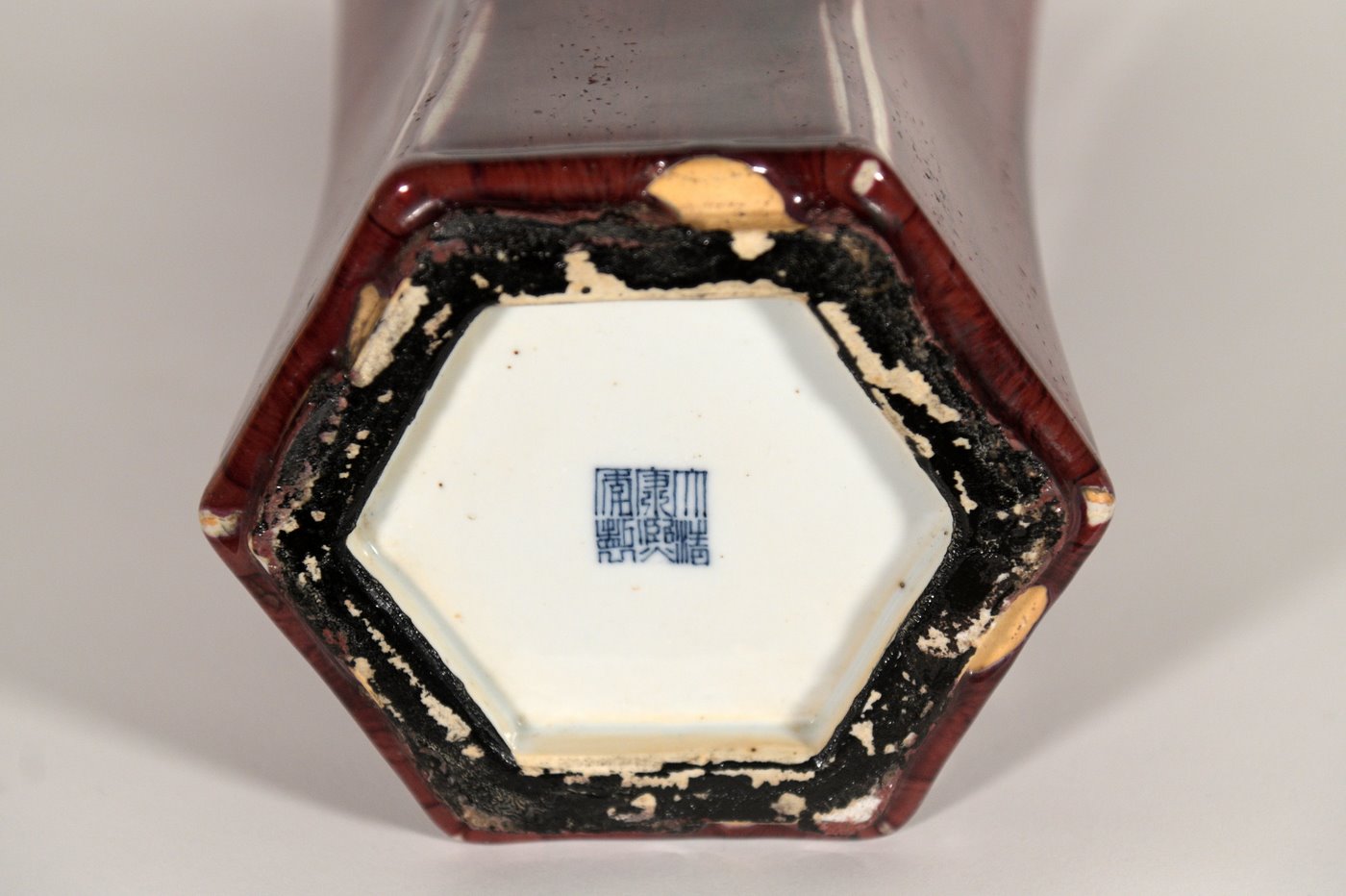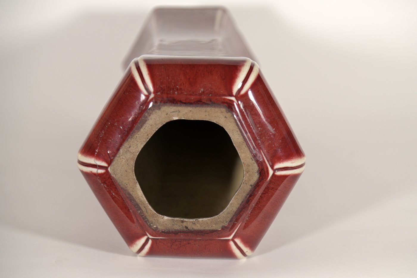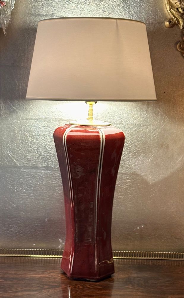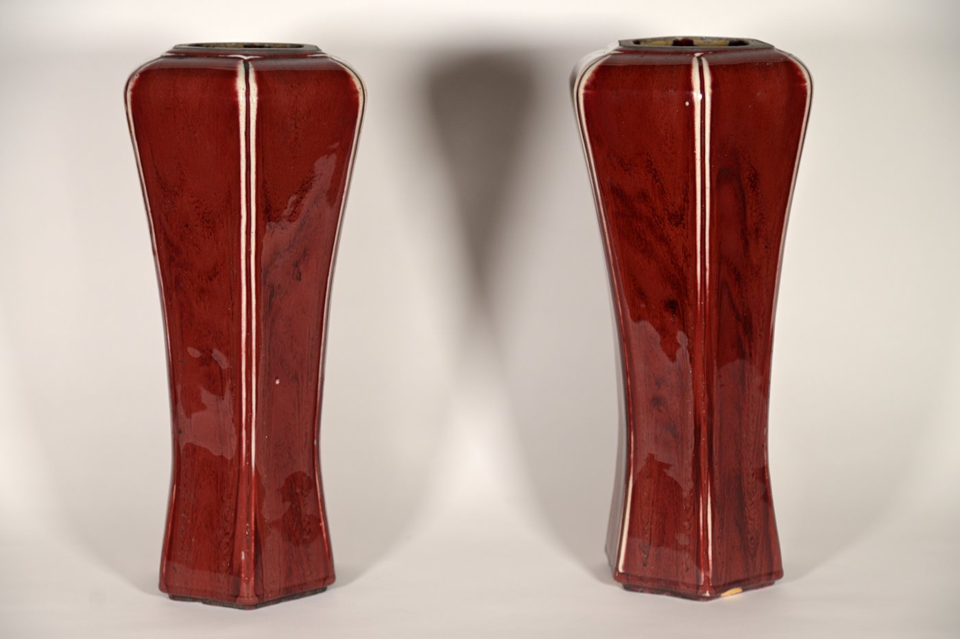 A pair of large Chinese 19th century baluster shaped red vases " sang de boeuf " with six sides , with lovely shades of red, with a blue seal under the base , now mounted as vases ( not pierced)