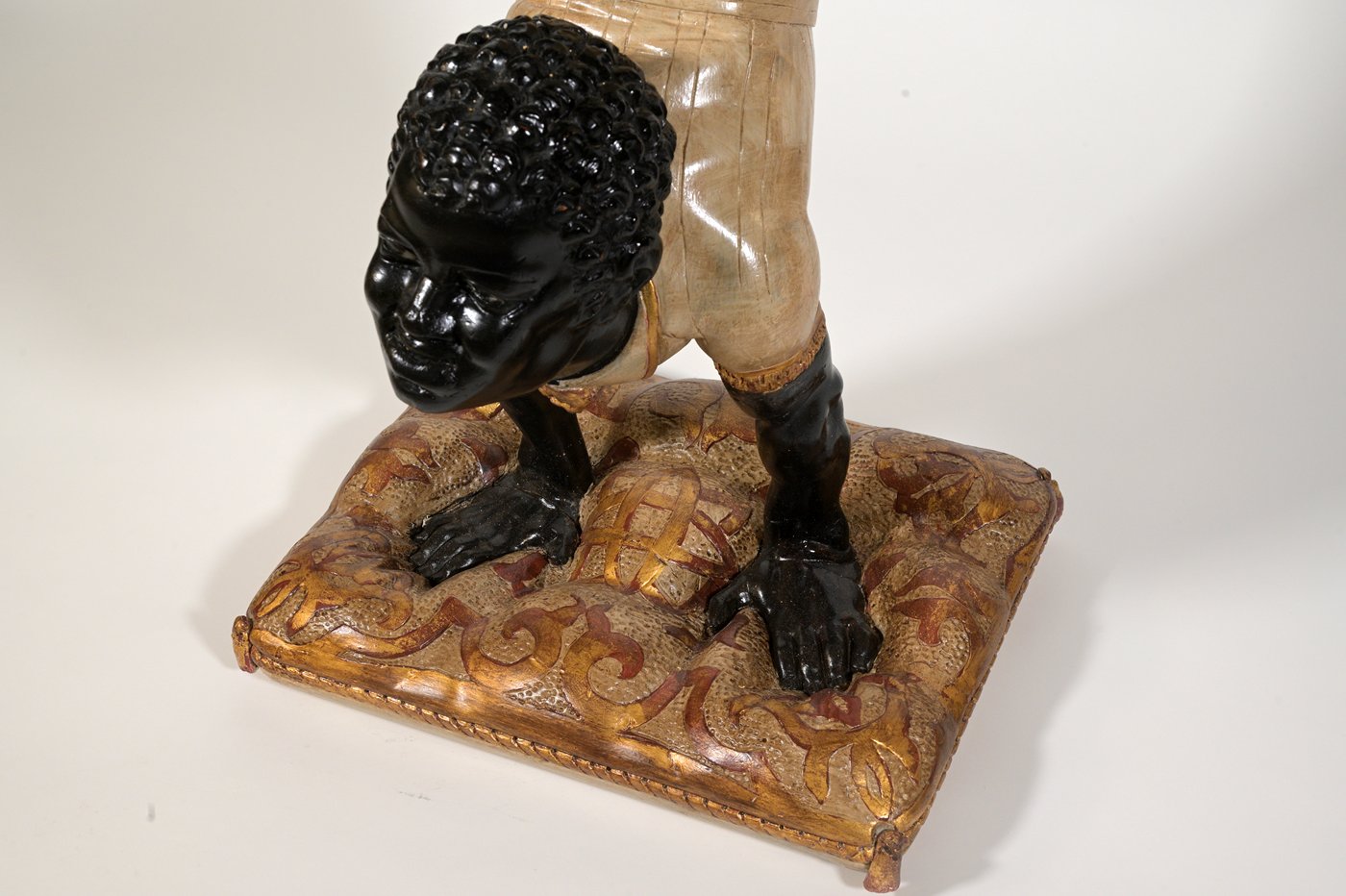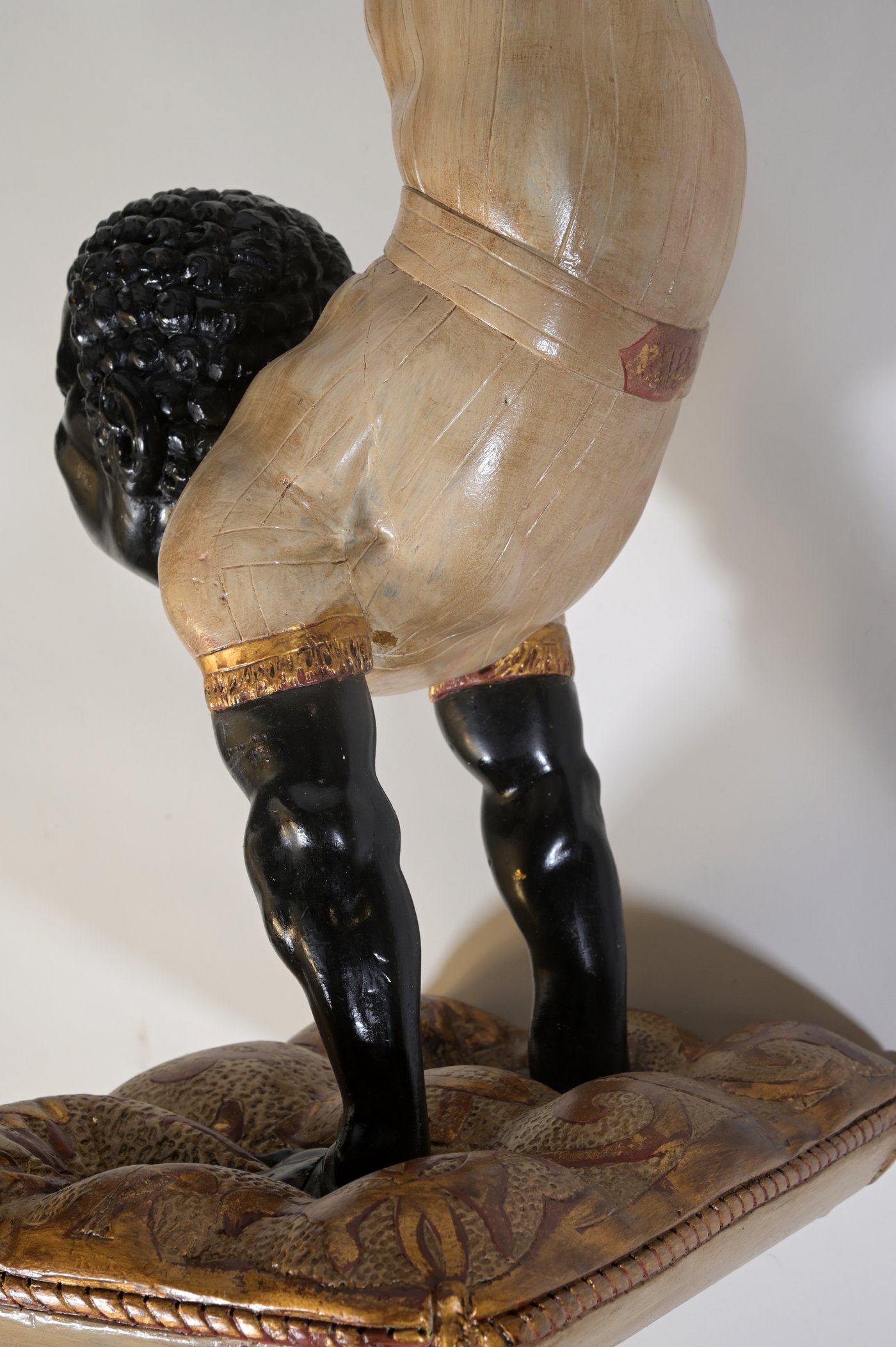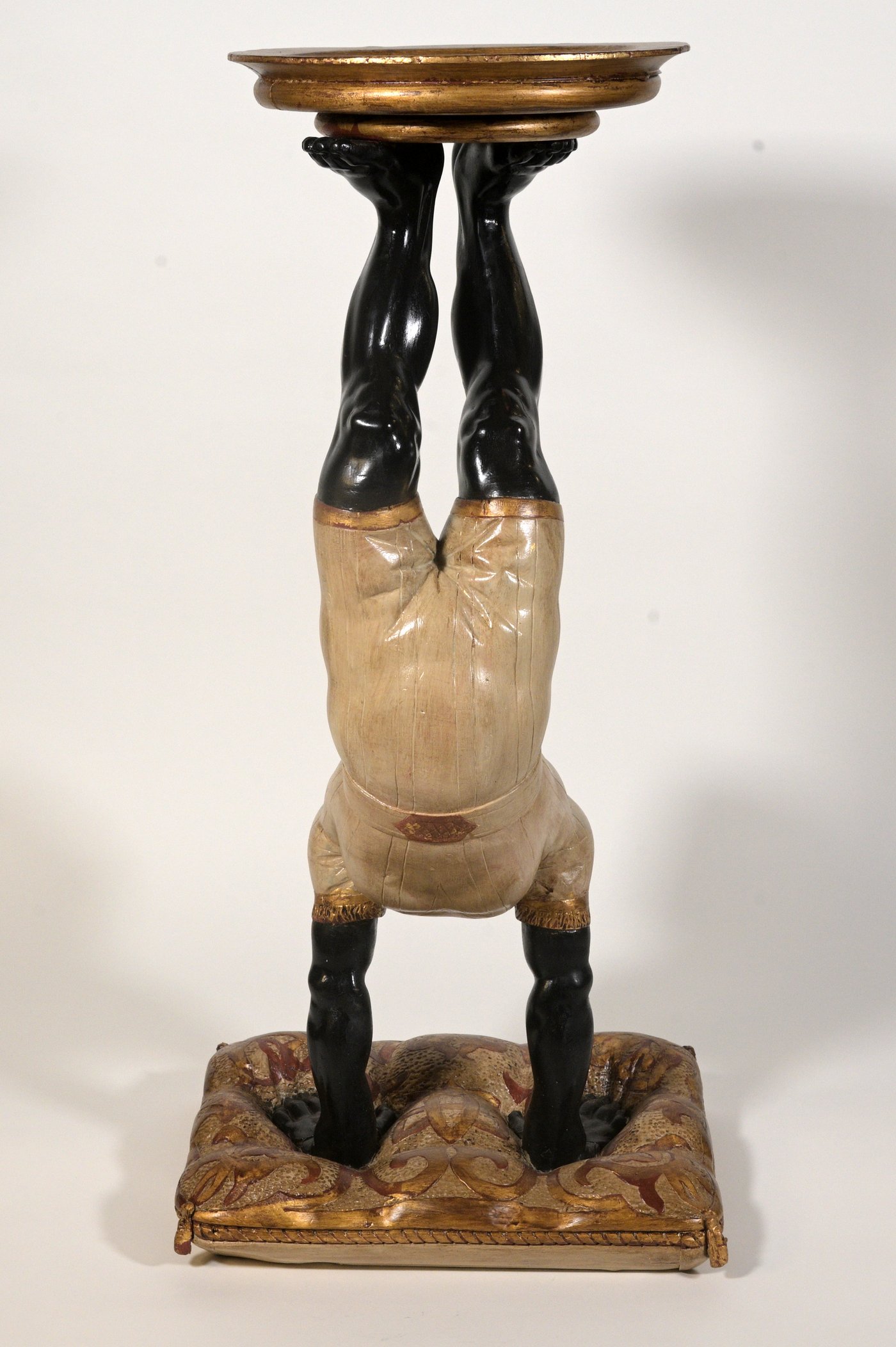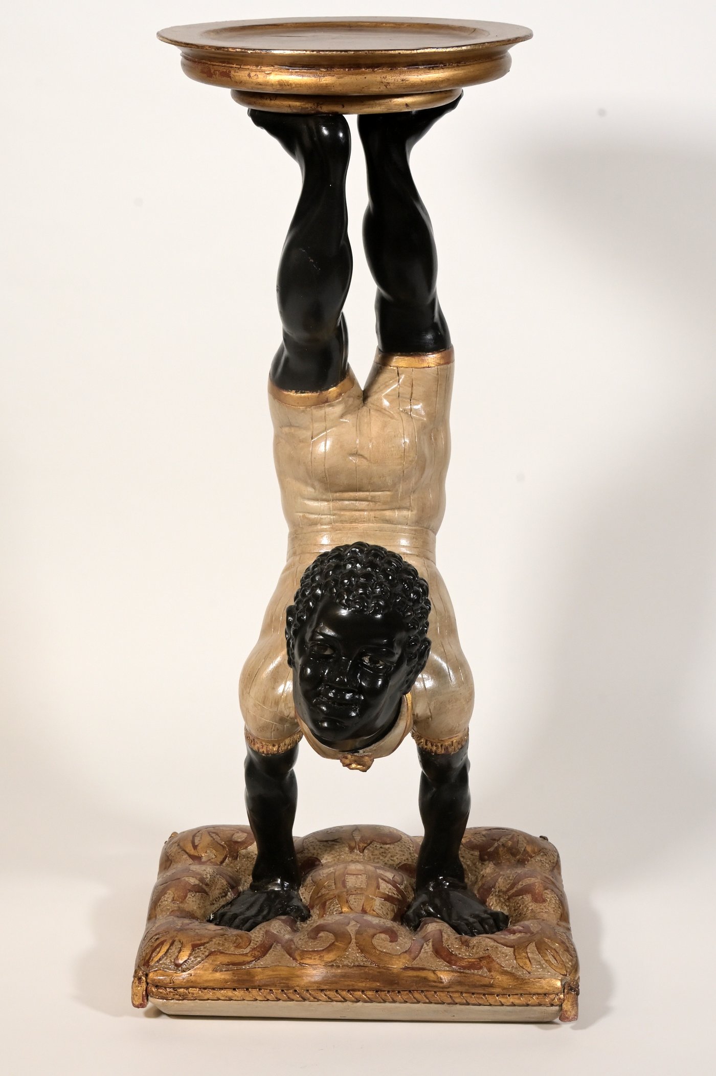 A Venetian Rococo style painted and parcel gilt low torchere in the shape of a young acrobat standing on his hands on a cushion, his feet supporting the circular dish.