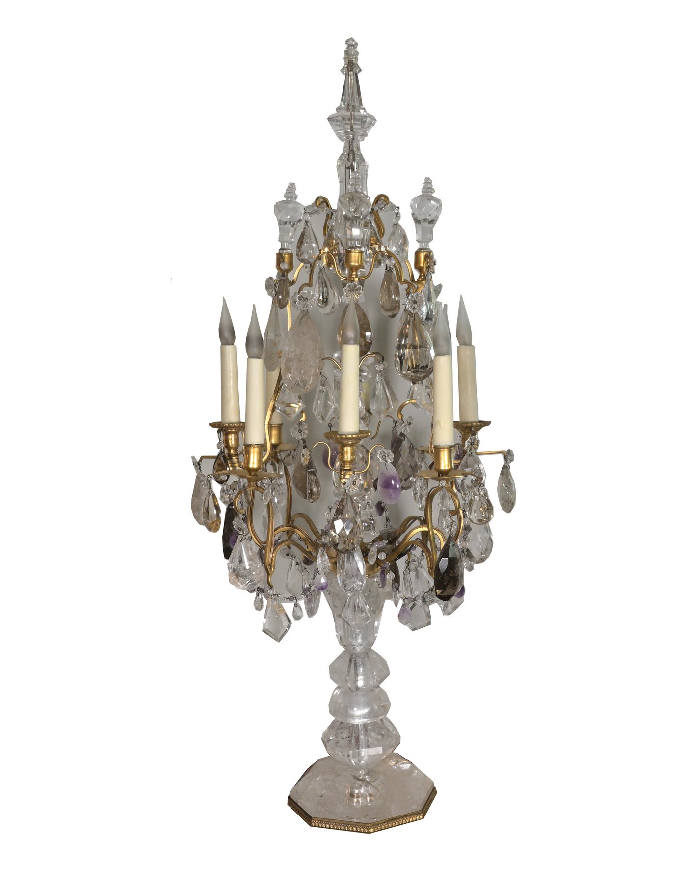 An exceptional pair of large French Louis XV style rock crystal, amethyst and gilt bronze girandoles on octogonal rock crystal bases , by the famed Maison Baguès, Paris, circa 1930.