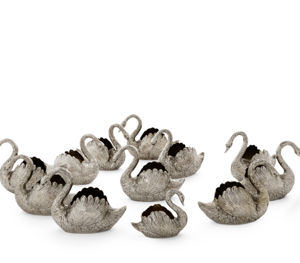 Set of twelve silver and vermeil swans