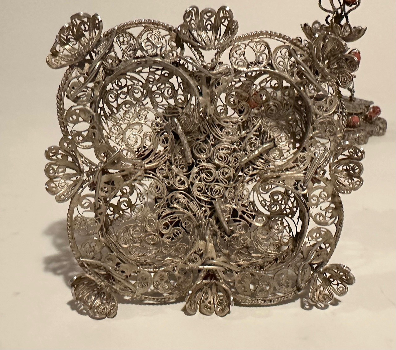 A rare pair of Italian baroque silver filigree groups topped with two coral putti on silver filigree square bases adorned with small red coral balls.