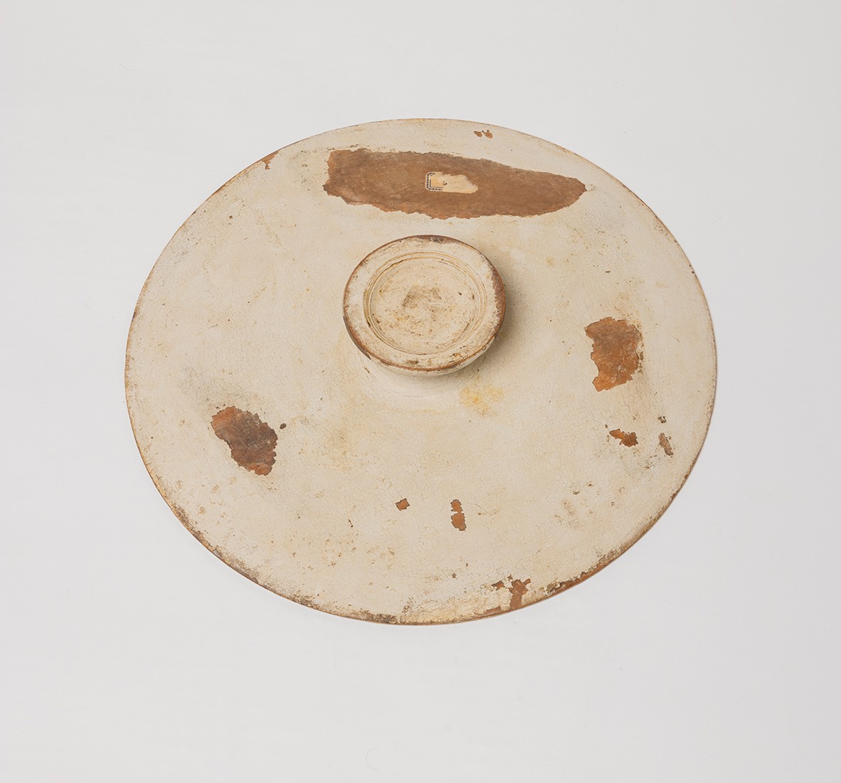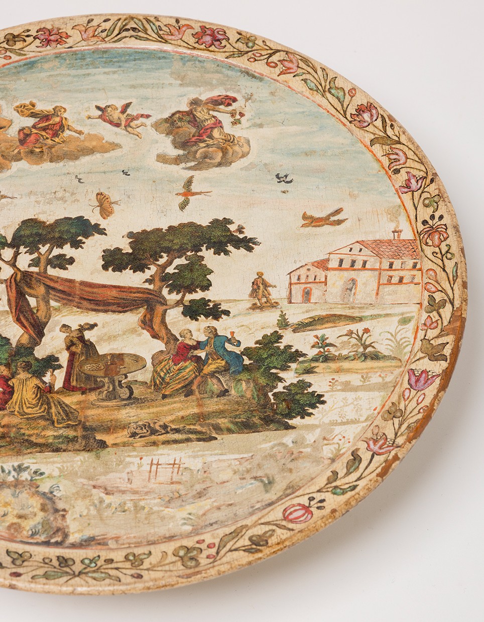 A rare Venetian cream painted wood with arte povera decoration circular tray on a round stand , representing a love scene in the country side.